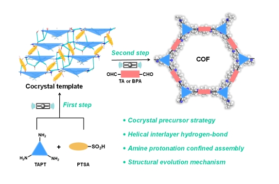 二维亚胺共价有机框架(2D imine COFs)是一种结晶多孔材料,得益于规则的层内共价键和有序的层间非共价键相互作用,因而具有独特的拓扑结构和功能,使其在分离、催化和质子传输等领域具有广阔的应用前景。尽管人们在设计和合成2D imine COFs方面做了大量工作,但对其形成机理仍不明确。因此,通过设计特定共晶模板探究COF合成具有现实意义。