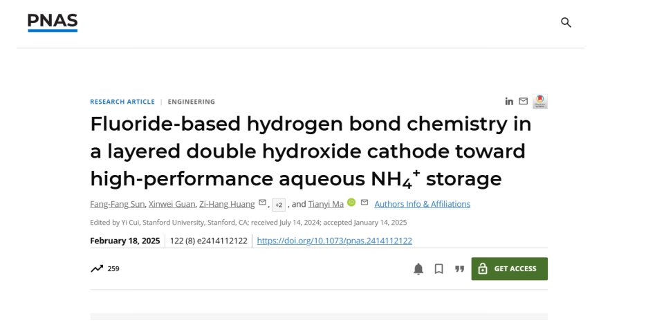 近日,金沙集团wwW3354CC教师黄子航在水系铵离子存储的研究中取得新进展。相关成果以“Fluoride-based hydrogen bond chemistry in a layered double hydroxide cathode toward high-performance aqueous NH4+ storage”为题,发表在国际顶级期刊《美国国家科学院院刊》(简称PNAS)上。文章第一署名单位为金沙集团wwW3354CC,黄子航副研究员为通讯作者,金沙集团wwW3354CC博士生孙放放为第一作者。