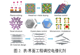 表/界面工程策略:通过空位引发的电子效应、金属/非金属掺杂调控活性中心结构,以及构筑亲疏水可控界面,解决电催化剂的过电势高、选择性差、动力学缓慢和稳定性不足等问题。